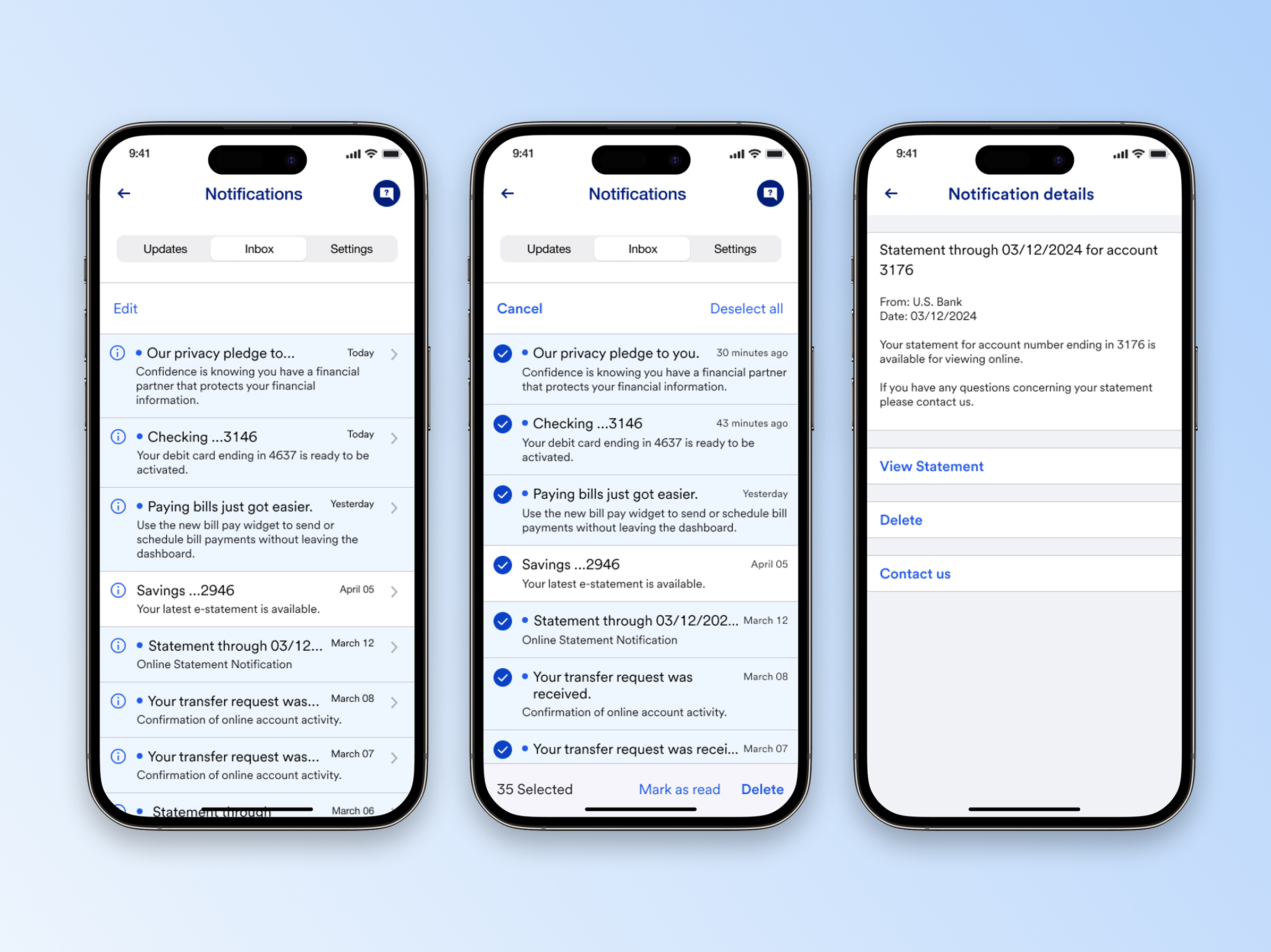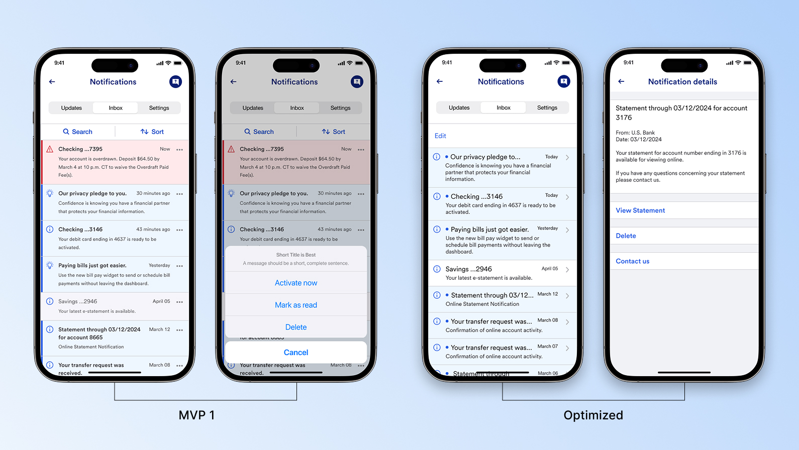 Creating a brand-new in-app notification center for the U.S. Bank native app was an exciting challenge that required a user-first approach and cross-functional collaboration. The goal was to provide users with a secure, organized, and intuitive hub where they could easily access and manage their important account updates and notifications in one place.