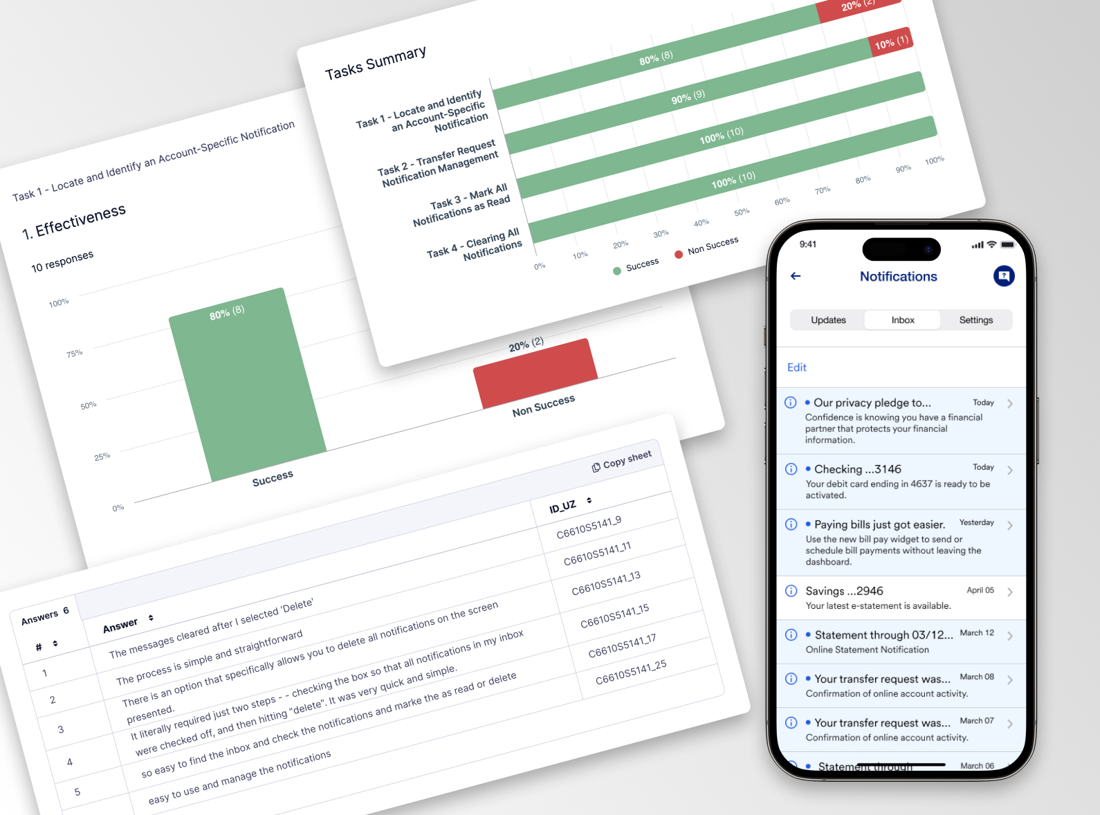 • Participants were asked to complete key tasks, such as finding notifications, marking them as read, deleting notifications, and taking action on account alerts.